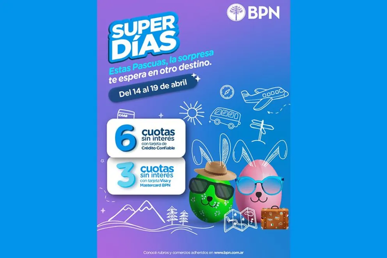 Se trata de Super Días Pascuas, una campaña que comenzó este lunes 14 de abril y se extenderá hasta el sábado 19. La promoción ofrece hasta 6 cuotas sin interés abonando con la tarjeta de crédito Confiable y también 3 cuotas sin interés con Visa y MasterCard emitidas por BPN.