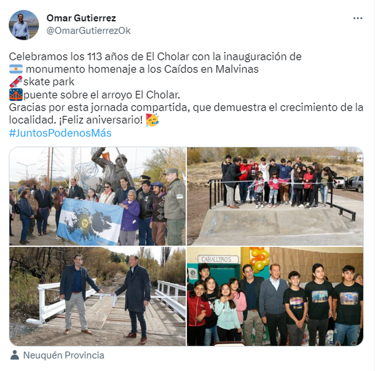 El gobernador Omar Gutiérrez acompañó este martes al intendente Néstor Fuentes en los festejos por el 113º aniversario de El Cholar. Como parte de las actividades previstas fueron entregadas tres nuevas viviendas y se inauguraron el monumento en homenaje a los Caídos en Malvinas y la pista de skate park.