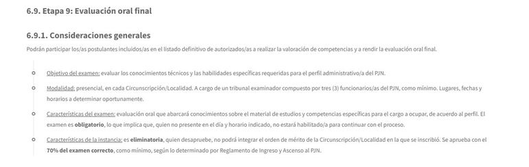 En la sección PROGRESO del portal del ingresante se publicará oportunamente el día, horario y lugar para rendir la evaluación oral final. El material de estudio será el mismo que el utilizado en la Etapa 5 (sobre Conocimientos Específicos). Se indicará también el módulo específico que se evaluará, en función del fuero/organismo que seleccionó cada postulante cuando realizó el relevamiento de intereses y preferencias. Se aclaró que no será posible solicitar modificaciones.