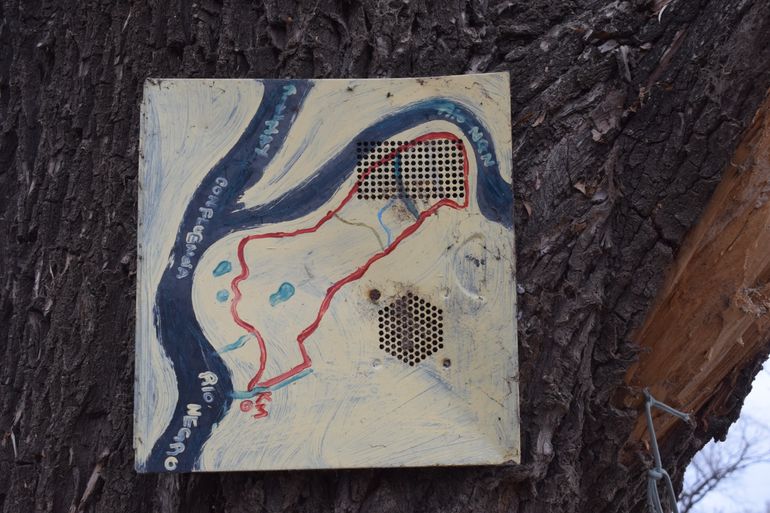 Un dibujo anónimo pintado en una chapa clavada en un árbol despierta curiosidad para propios y extraños en ese sector de Cipolletti.
