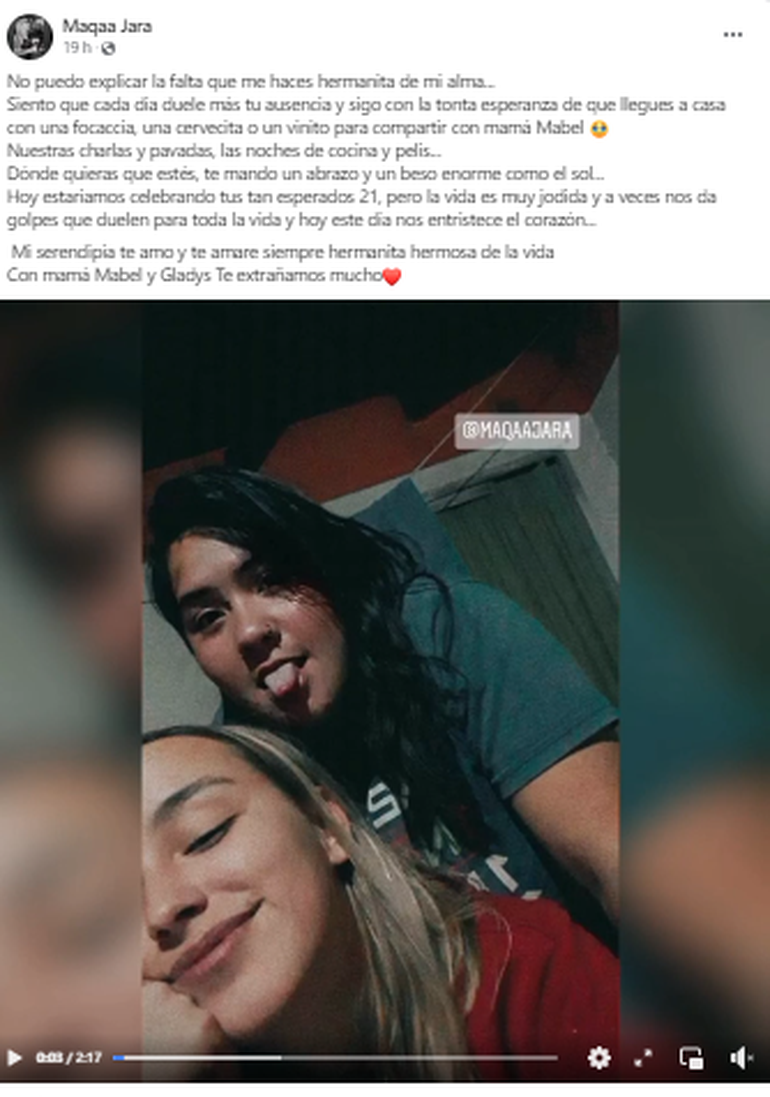 "No puedo explicar la falta que me haces hermanita de mi alma...Siento que cada día duele más tu ausencia y sigo con la tonta esperanza de que llegues a casa con una focaccia, una cervecita o un vinito para compartir con mamá Mabel Nuestras charlas y pavadas, las noches de cocina y pelis...Dónde quieras que estés, te mando un abrazo y un beso enorme como el sol...Hoy estaríamos celebrando tus tan esperados 21, pero la vida es muy jodida y a veces nos da golpes que duelen para toda la vida y hoy este día nos entristece el corazón... Mi serendipia te amo y te amaré siempre hermanita hermosa de la vida. Con mamá Mabel y Gladys te extrañamos mucho", expresó Maga Jara.