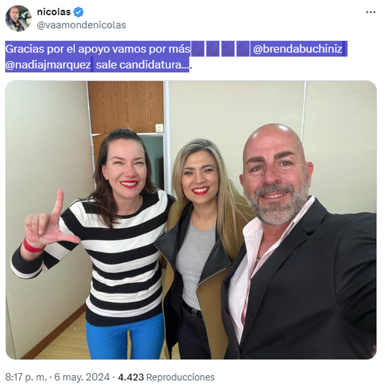 "Gracias por el apoyo vamos por más. Sale candidatura", publicó en su cuenta de X donde mostró la imagen con las dos dirigentes partidarias, que llevó a Milei a la Casa Rosada.
