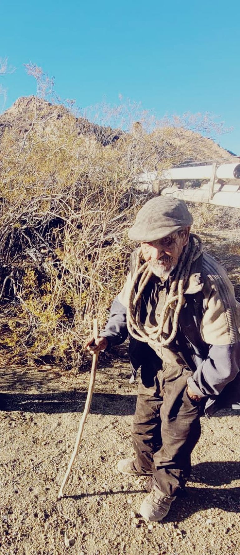 Méndez contó también un poco la cotidianidad de don Peto. “El arma fuego en la chocita que tiene sobre el cerro y se abriga bien y así pasa los días. Ayer lo encontramos cuando andaba buscando leña por eso andaba con una soga al cuello. Con esa soga arma pequeños atados de leña de jarilla y de todos los arbustos de la zona y los acarrea para su casa. Nos contó que en las noches no pasa frío”.