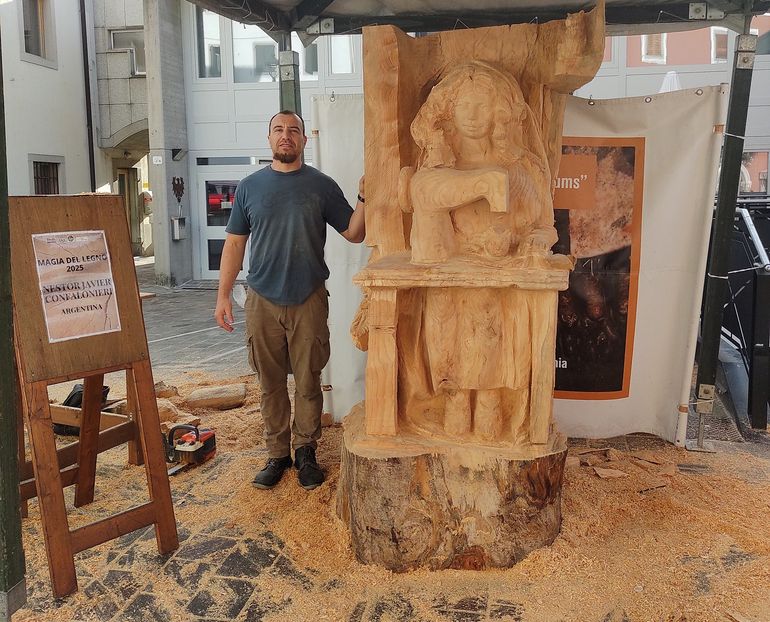 Con anterioridad, el artista había sido convocado en septiembre pasado a Sutrio, Italia, al tradicional Festival “Magia del Legno”. Allí esculpió una figura de tamaño natural en un tronco de madera de cedro del Líbano de 400 kilos, en el término de una semana intensa de trabajo. Su obra representa a una costurera y se titula “Rita Bertolini”, en alusión al nombre real de una costurera patagónica ya fallecida.