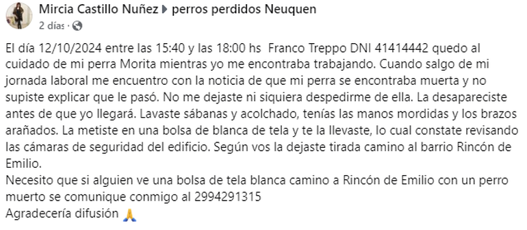 La dejó a cargo de un excompañero de trabajo para que la cuide. En su ausencia, algo pasó en su departamento de la calle Castelli 256. "Se murió o la mató, nunca lo voy a saber; tomó una bolsa y se deshizo del cuerpo. Él me dijo que se había atragantado, que trató de ayudarla y por eso tenía todos sus brazos arañados y las manos mordidas; que descartó su cuerpo en el barrio Rincón de Emilio porque no quería que viera a mi perra muerta. Pero … ¿Por qué lavó las sábanas y el acolchado? ¿Por qué no me llamó para decirme lo que había pasado? ¿Por qué hizo desaparecer su cuerpo y después se fue a hacer Pedidos Ya? Hasta el día de hoy yo estoy tirada y tratando de recuperarme. Parece que estoy soñando, no lo puedo creer, sinceramente", expresó la vecina, en diálogo con LMNeuquén.