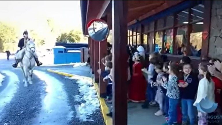 Los vecinos también se vieron sorprendidos al ver cabalgar al Padre de la Patria, personificado por un actor local, en su recorrida por las calles nevadas de la localidad. El jinete visitó las escuelas 353, 186, 361, 104 y 341; el CPEM 68 y el CPEM 17; la Escuela Espacial 18; y los jardines de infantes 82 y Frutillitas.