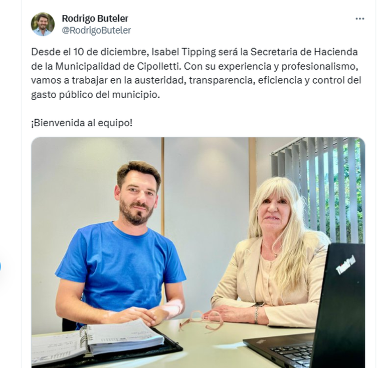 A poco menos de 20 días para el cambio de gestión, el futuro Municipio de Cipolletti comienza a tomar forma con la definición del Gabinete. El intendente electo, Rodrigo Buteler, trabaja con hermetismo en los nombramientos, por lo que no se filtraron nombres, pero llega el tiempo de las confirmaciones. La primera secretaría confirmada es la de Hacienda, que estará a cargo de Isabel Tipping.