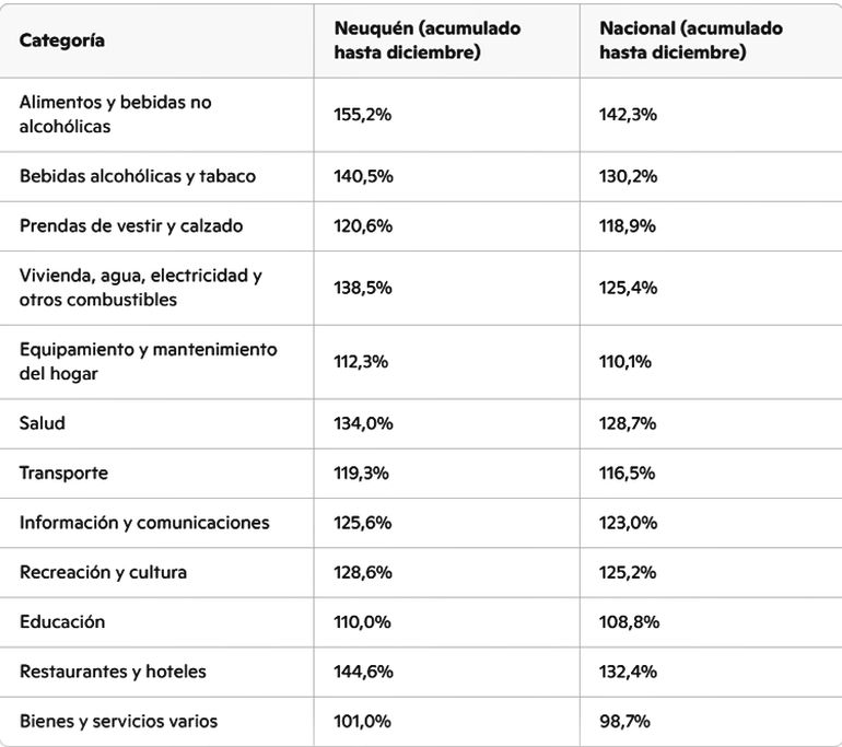Las distintas categorías de bienes y servicios también muestran variaciones importantes cuando se comparan los datos acumulados de Neuquén y el promedio nacional.