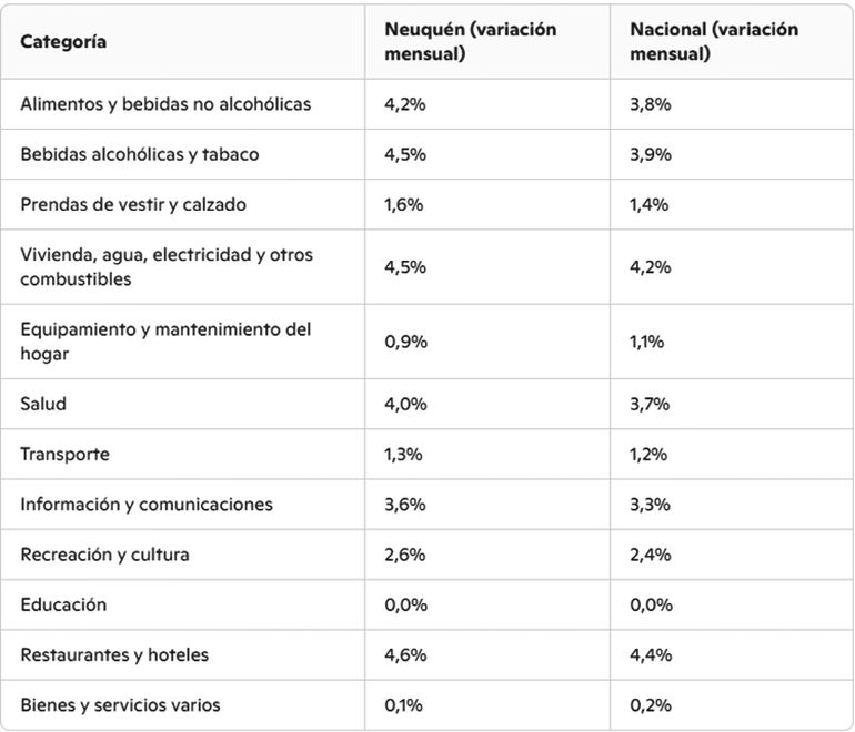 En Alimentos y bebidas no alcohólicas Neuquén registra un aumento mayor (4,2%) en comparación con el promedio nacional (3,8%). Este incremento impacta directamente en el costo de la canasta básica.