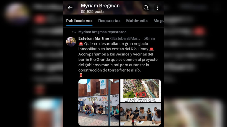 "Queremos una ciudad escalada, una que no tape el río", reiteró. Luego, el reclamo de los vecinalistas fue viral cuando la diputada nacional Myriam Bregman se hizo eco y apoyó con un posteo.