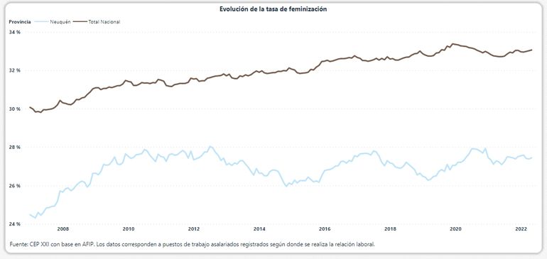 Es decir, el crecimiento de la porción de mujeres en el mundo del trabajo fue similar en Neuquén que en el promedio del país, las diferencias actuales ya existían hace 15 años.