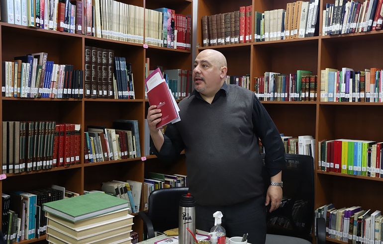 Sobre el escritorio, de anteojo, guantes y con un pincel en la mano, Jorge limpia los libros que hay que reacomodar en las estanterías. Un chico pide un vidrio para cortar el cartón de las maquetas y que no se dañe la mesa. Jorge sale inmediatamente y se queda mirando lo que hacen los estudiantes de la escuela técnica. “Están haciendo la Casa Curutchet”, dice casi susurrando, con cierto grado de admiración y un poco de orgullo, con una sonrisa que le ocupa la cara.