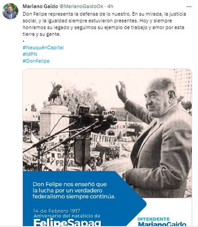 Gutiérrez destacó que Felipe fue “un hombre precursor, pionero y fundador de un antes y un después del país”. Sostuvo que “sembró siempre con lealtad y nobleza, agrandando los espacios, la provincia, el pueblo” y agregó: “hay que rescatar los valores pioneros de una familia que entregó la vida por y el pueblo de la provincia de Neuquén”.