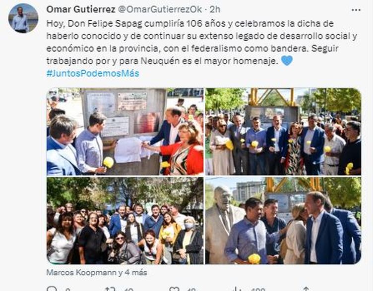 Con motivo de cumplirse este martes el 106º aniversario del natalacio de Felipe Sapag, se realizó un acto homenaje en el monumento ubicado en calle Alcorta y Avenida Olascoaga. La actividad contó con la presencia del gobernador Omar Gutiérrez; el vicegobernador Marcos Koopmann; el intendente de la ciudad, Mariano Gaido; y referentes del Movimiento Popular Neuquino como el gobernador mandato cumplido Jorge Sapag, Ana Pechén, y Alma “Chani” Sapag, entre otros.