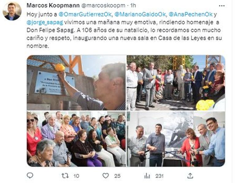 Por su parte, Koopmann resaltó “el legado que nos dejó, con su historia, con su humildad, con su mirada noble, con su caminar que todos recordamos, pero sobre todas las cosas nos dio la historia del Movimiento Popular Neuquino”. Dijo que “él y su equipo, con Elías, con Amado, nos dieron la transformación pero sobre todo la independencia y la libertad y poder elegir el destino de la provincia de Neuquén”.