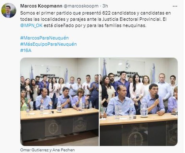 “Hoy es un día muy importante para la historia de nuestro partido, para nuestro proyecto, somos el primer partido en presentar ante la Justicia Electoral los candidatos que van a seguir defendiendo a las familias neuquinas”, dijo Koopmann.