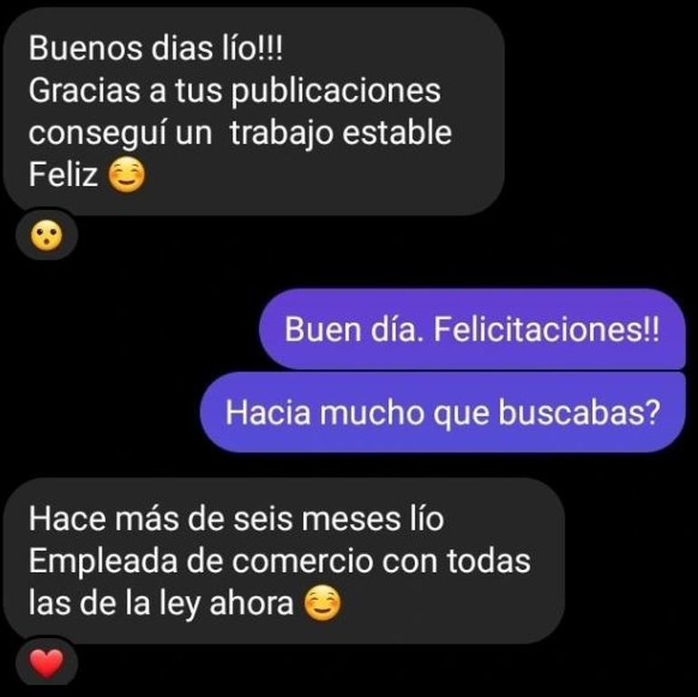 Buscando el trabajo que mejor le calce, encontró algo parecido a lo que tiene ahora. También otra chica altruista que subía a sus estados gran cantidad de avisos publicitarios de onda. El problema fue que no se bancó los comentarios de los que critican por criticar nomás, sin aportar soluciones. "Porque en las redes es así, cuando te equivocás te dan entre todos, pero cuando hay que hacer...nadie dice yo lo hago y se pone en primera persona", advirtió Lio.