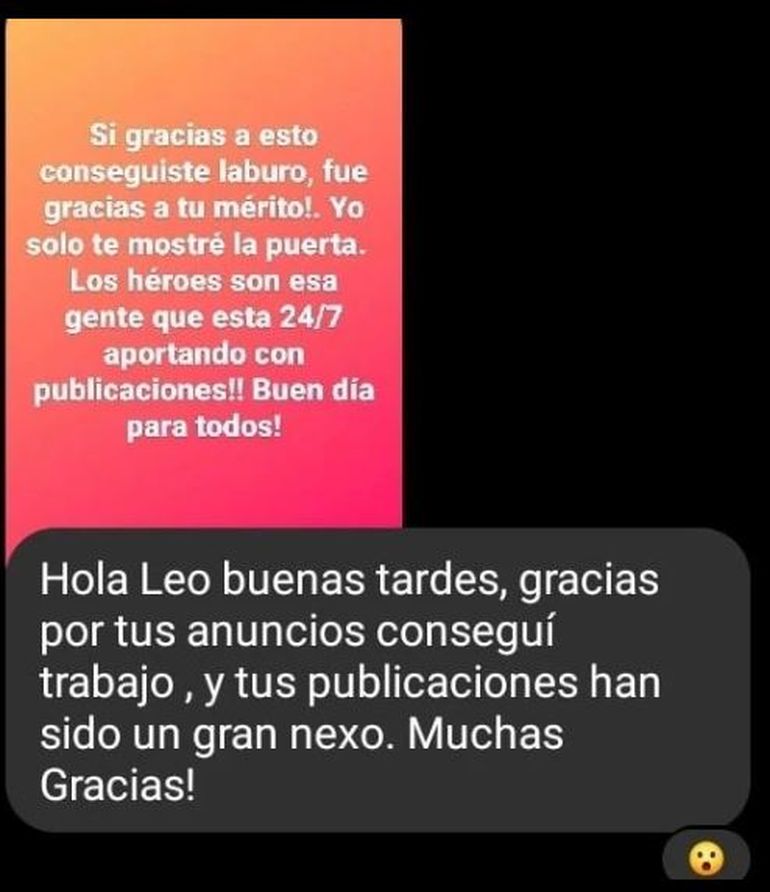 Entonces Lio tomó la posta y se convirtió con los años en una bolsa de trabajo tremenda que empezó en Facebook y grupos de Whatsapp y ahora se vuelca de lleno a las historias de Instagram. Aclaró que no es el único porque recibe la ayuda de otras personas. "Me piden que publique alquileres o avisos de cuidado de animales, pero yo solo publico avisos de trabajo", contó.