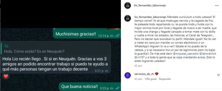 Dice que no le lleva más que unos segundos publicar los avisos en sus historias. Pero sí se toma tiempo para responder inquietudes y contestar mensajes. Mucha gente le ha pedido conocerlo, y como una forma de agradecerle, también lo invitaron infinidad de veces a comer un asado. Pero Lío prefiere mantener el perfil bajo, como una suerte de enigma que lleva a muchos a buscarlo por las redes, en el afán de poner rostro al hombre que los ayudó a encontrar trabajo.