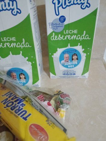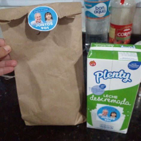 Entre las colectoras está la del partido Juntos por la Vida que eligió el color celeste para hacer su propaganda electoral. Los dirigentes de esta lista fueron los que se tomaron el trabajo de colocar un sticker con la cara de Peressini y de Palma en cada una de las cientos de leches larga vida que repartieron, al igual que los trozos de queso fresco y golosinas.