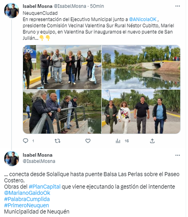Por su parte, Isabel Mosna, a cargo de la intendencia, remarcó que “la inauguración de este puente apunta a la conectividad del Paseo Costero hacia Valentina que es un proyecto que estaba en carpeta porque hace al turismo local y reactivarlo porque aporta a la economía local”