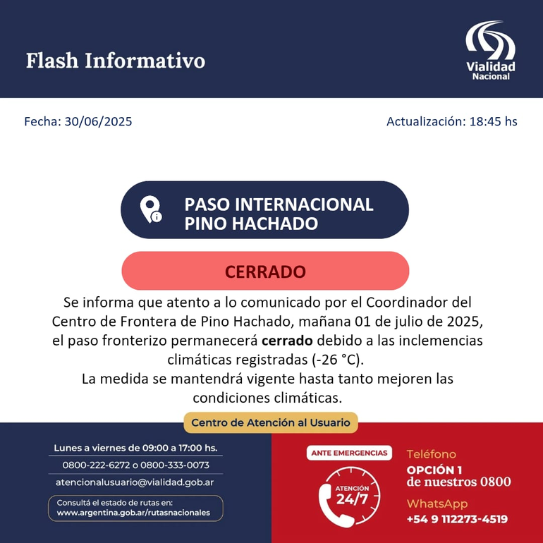 Las autoridades recomendaron a quienes tuvieran previsto viajar por ese paso que posterguen sus traslados y se mantengan informados a través de los canales oficiales. Además, recordaron que el estado de rutas puede consultarse en el sitio web de Vialidad Nacional: www.argentina.gob.ar/rutasnacionales.