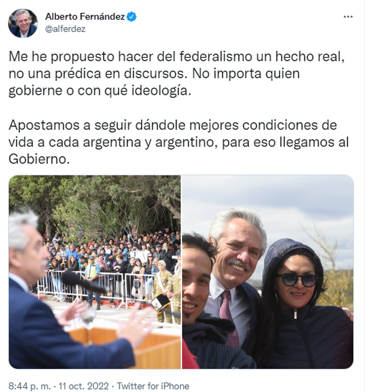 Tras el acto, el presidente abordó una trafic blanca y se perdió de vista cuando el desfile comenzaba. "Me llena de alegría y emoción estar acá. Por muchos más habitantes en Centenario", exclamó Fernández, antes de poner fin a su discurso.