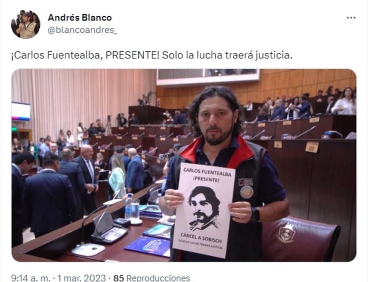 La sesión empezó con la presencia de 31 diputados. Previo a la entonación de los himnos y el discurso del gobernador Omar Gutiérrez, se procedió al izamiento de la bandera. Fue allí que Blanco, frente a todos los presentes, levantó un cartel con la imagen de Fuentealba. "Cárcel a Sobisch. Solo la lucha traerá justicia", pidió.