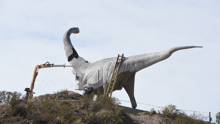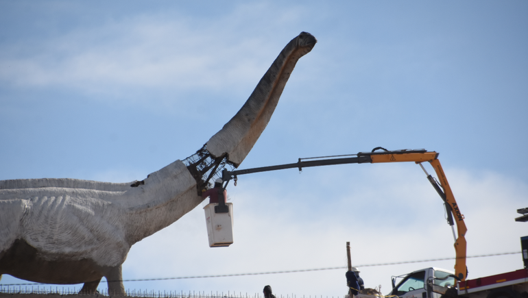 Según detalló, este dinosaurio tiene un peso total de casi 14 toneladas y todo el traslado fue supervisado por el escultor. “El próximo paso es elevarlo hasta lo más alto porque va a ser el estandarte del parque de dinosaurio”, aseveró.
