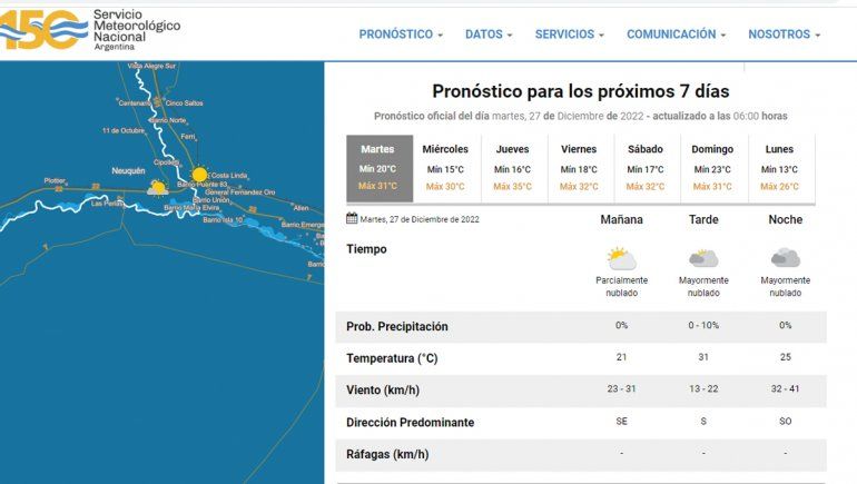 El Servicio Meteorológico Nacional (SMN) pronosticó para esta mañana cielo parcialmente nublado con una temperatura de 21 grados mientras que en horas de la tarde ascenderá a una máxima de 31 grados con cielo mayormente nublado con bajas probabilidad de precipitaciones. Hacia la noche se mantendrán las condiciones y la temperatura descenderá a los 25 grados. Habrá viento de intensidad variable en el Alto Valle.