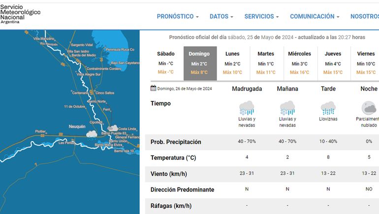 El pronóstico anticipaba una jornada fría para este sábado feriado del 25 de mayo. Nevó en algunos lugares pero no en el Altovalle como se anticipaba. ¿Será mañana?