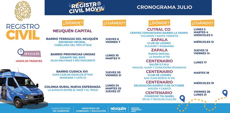El jueves 20 y viernes 21 el dispositivo del Registro Civil estará en el oeste de la capital neuquina. Funcionará en el Barrio Cuenca XVI, en Juan Carlos Davalos Nº7013 Manzana 7 Lote 10. El lunes 24, martes 25 y jueves 27 brindará atención en la calle La Alfalfa entre El Maíz y El Trigo.