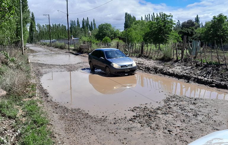 La calle que comienza sobre la margen sur de la Avenida Mosconi (exruta 22), y conecta hasta el puente que cruza a Las Perlas, separando los ejidos de Neuquén y Plottier, queda completamente bajo agua luego de cada lluvia. "Está dinamitada", señala Gustavo, un vecino que vive sobre esta vía, y que muestra que el pozo más chico "mide entre 50 y 60 centímetros".