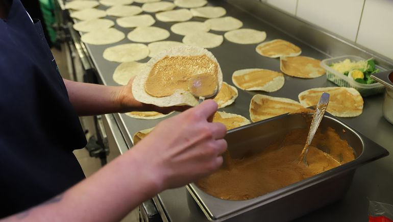 El grupo se divide en tres sectores. El salón, a cargo de Luján, quien lidera al equipo de mozos. La cocina, con Lautaro al frente, responsable de cocineros, panaderos y bacheras. Y el área de despacho y depósito, encabezada por Lorena, que se encarga de repartir las viandas.