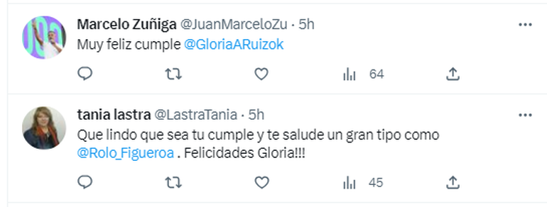 "Qué lindo que sea tu cumple y te salude un gran tipo como @Rolo_Figueroa. ¡Felicidades Gloria!", saludó la rionegrina a la jefa comunal de Plottier en su cumpleaños.