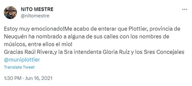 Hace un tiempo, Nito Mestre también dijo presente en las redes para manifestar su agradecimiento por ser homenajeado en el mencionado barrio. El compañero de Charly García en Sui Generis manifestó que estaba muy "emocionado" con la noticia de que una calle neuquina fue bautizada con su nombre.