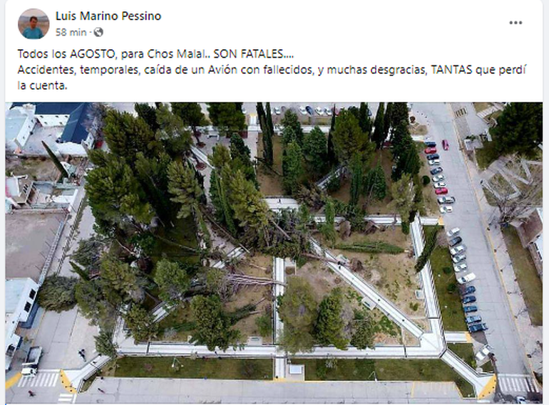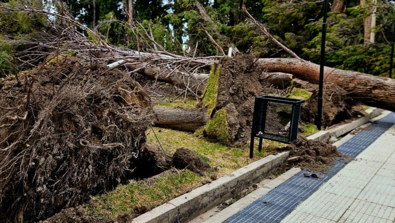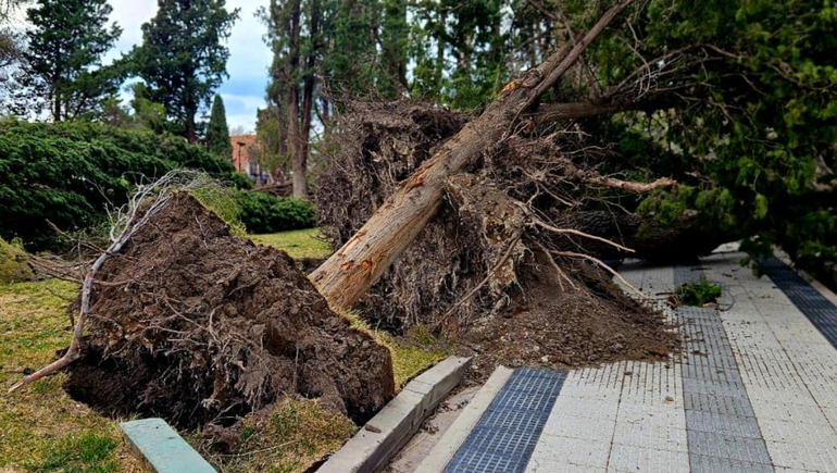 Las fuertes ráfagas de viento que se registraron en Chos Malal, de casi 100 kilómetros por hora, destruyeron la histórica plaza San Martín. Mientras el lugar era arrasado por el viento, empleados municipales trabajaban sin descanso para responder a la contingencia. Al menos 20 árboles de gran porte cayeron y los que todavía siguen en pie tal vez haya que cortarlos porque son una amenaza latente. El fenómeno causó mucho dolor en la localidad.