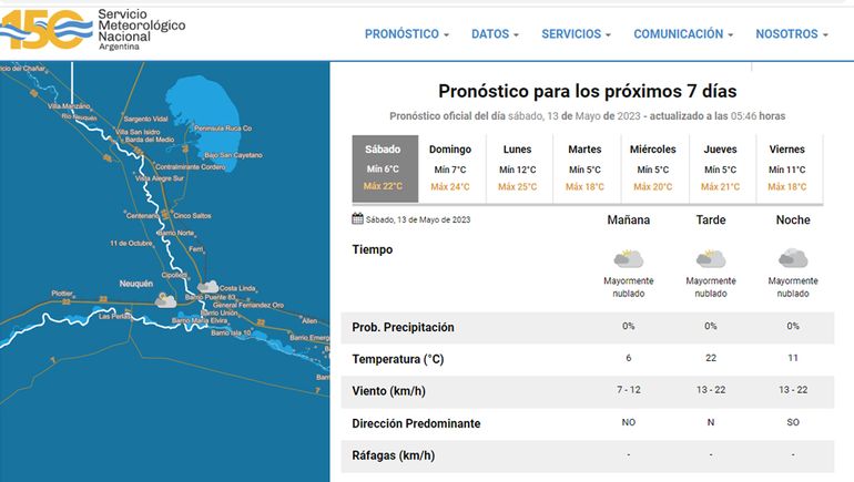 El pronóstico para este inicio del fin de semana anticipa una jornada con temperaturas agradables en Neuquén. La mínima será de 6 grados y la máxima llegará a los 22 grados. El cielo estará mayormente nublado durante todo el día, pero no están previstas lluvias. Seguirá el viento débil proveniente del sector sudoeste.