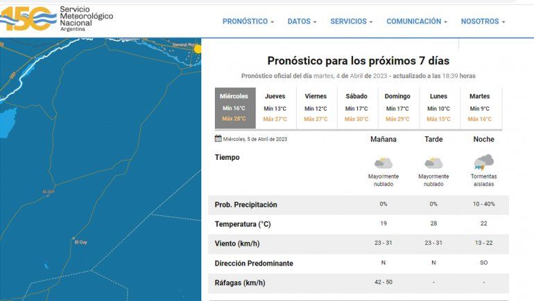 Según el Servicio Meteorológico Nacional (SMN), el tiempo para esta mañana estará casi primaveral con una temperatura de 19 grados y cielo mayormente nublado que se extenderá hacia el resto de la jornada. En horas de la tarde la temperatura ascenderá a los 28 grados de máxima mientras que hacia la noche descenderá a los 22 grados con probables tormentas aisladas (10-40%) en la región. El viento estará presente de leve a moderado durante la mañana y tarde con ráfagas entre 42 y 50 kilómetros por hora.
