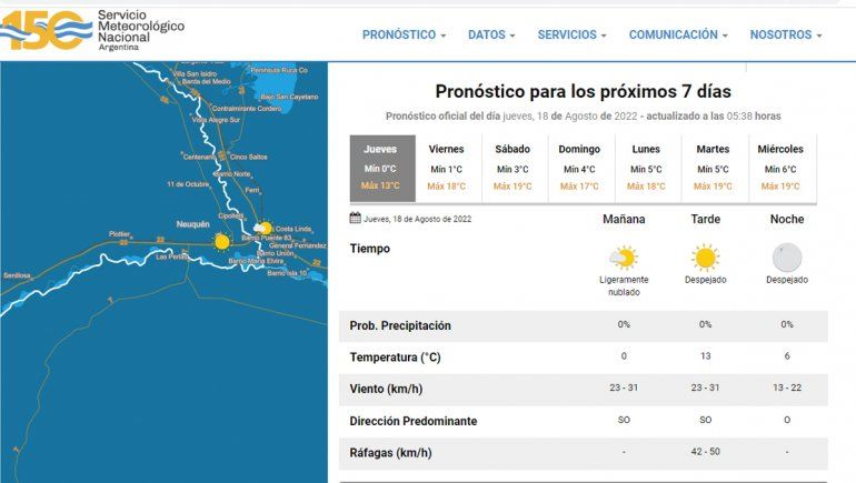 Por la mañana estará ligeramente nublado con una temperatura de cero grados. A las 6 de este jueves el Servicio Meteorológico Nacional (SMN) registró una sensación térmica -4 grados. Hacia la tarde estará soleado con una temperatura que alcanzará los 13 grados, mientras que en horas de la noche descenderá a 6 grados con cielo despejado. El viento estará entre 23 y 32 kilómetros por hora con ráfagas de 42 a 50 kilómetros por hora.
