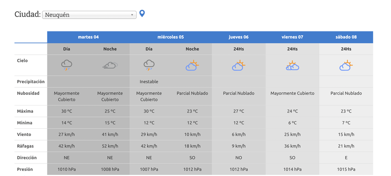 Pero el tiempo comenzará a cambiar a partir del martes, cuando el cielo se cubra de nubes y vuelva a amenazar la lluvia a las ciudades del Alto Valle. La temperatura máxima rondará entre lo 27 y los 29 grados, pero se esperan tormentas, lluvias y chaparrones, principalmente a partir de la tarde. También se registrarán vientos de leve a moderado, que podrían alcanzar los 50 kilómetros por hora de intensidad.