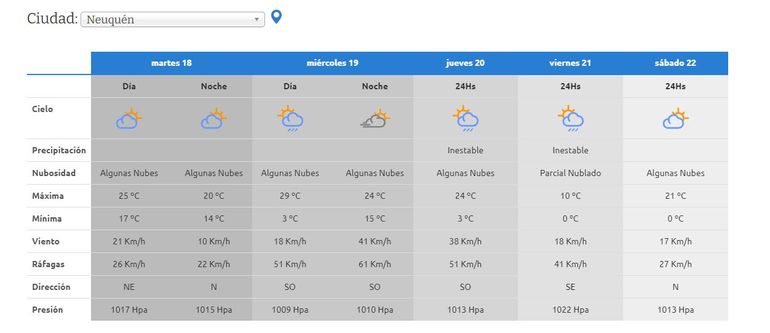 El jueves y viernes se mantienen la inestabilidad en la zona, con posibilidades de lluvias, pero con registros térmicos más agradables. Las mañanas estarán frescas con mínimas cercanas a los 0 grados y máximas que no superarán los 24 grados. El sábado se va la lluvia.