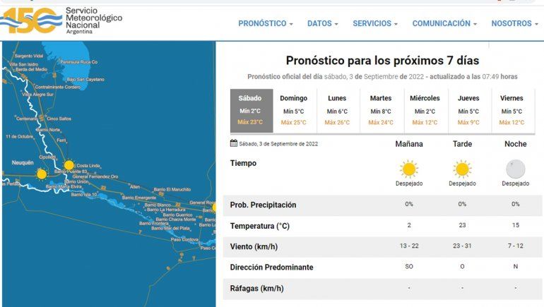El Servicio Meteorológico Nacional (SMN) pronosticó que estará soleado durante toda la jornada. La temperatura en horas de la mañana será de 2 grados y hacia la tarde ascenderá a una máxima de 23 grados. Por la noche continuará el cielo despejado con una temperatura que descenderá a 15 grados. Habrá viento entre 23 y 31 kilómetros por hora.
