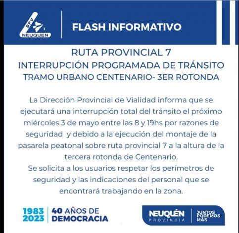 Desde este miércoles y hasta el domingo el tránsito en la tercera rotonda en la Ruta 7 de Centenario se verá interrumpido desde las 8 a las 18 por precaución, es que operarios se encuentran trabajando en la instalación de la pasarela peatonal, en el marco de la ampliación de esa arteria que conecta la ciudad con la capital. Hay un desvío para los automovilistas que ingresan a la ciudad.