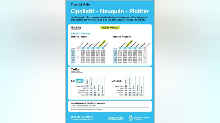 Si bien todavía es muy temprano para evaluar si el caudal de pasajeros es mayor a partir de la habilitación de otras paradas como la que está ubicada frente a la ETON y en cercanías al Aeropuerto Neuquén, Tamborindegui advirtió sí que en los nuevos puntos habilitados hay ascenso y descenso de personas. Lo mismo es posible que suceda en el apeadero del barrio Unión, de Plottier, que resulta operativo a partir de este martes.