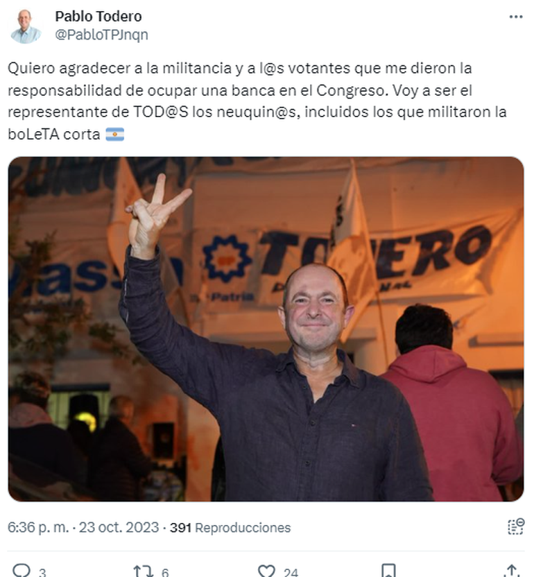 Finalizados los comicios y ya conocido el triunfo de Unión por la Patria, que le permitió al candidato a diputado nacional Pablo Todero ingresar al Congreso, éste publicó un tuit que encendió los humos nuevamente. En la red social indicó "Voy a ser el representante de TOD@S los NEUQUIN@S, incluidos los que militaron la boLeTA corta".