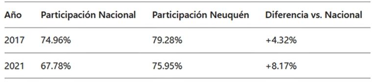 Más atrás en el tiempo, en las legislativas nacionales de 2013, la participación del electorado neuquino llegó al 81% en los comicios generales. En todos los casos, la porción del padrón neuquino que concretó su voto fue superior a la registrada sobre el padrón nacional.