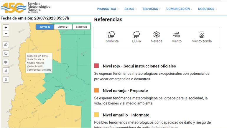 A partir de la tarde noche de este jueves, la zona de cordillera en la provincia de Neuquén se verá afectada por lluvias y nevadas. En la zona de Huilliches, Lácar y Sur de Aluminé se esperan lluvias a la tarde del jueves y nevadas a partir del mediodía del viernes. En la zona de Minas, Chos Malal, Loncopué y Picunches no se esperan lluvias, pero sí nevadas a partir del viernes al mediodía, por lo que también rige la alerta amarilla.