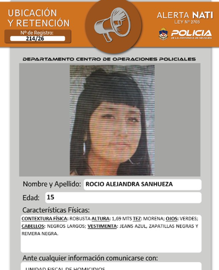 Se trata de la adolescente Rocío Alejandra Sanhueza, de 15 años, cuya denuncia por su desaparición fue radicada en la Comisaría Primera. De acuerdo a la descripción aportada, la joven tiene una contextura física robusta, de una altura de 1,69 metros, tez morena y ojos verdes. Sus cabellos son oscuros y largos.