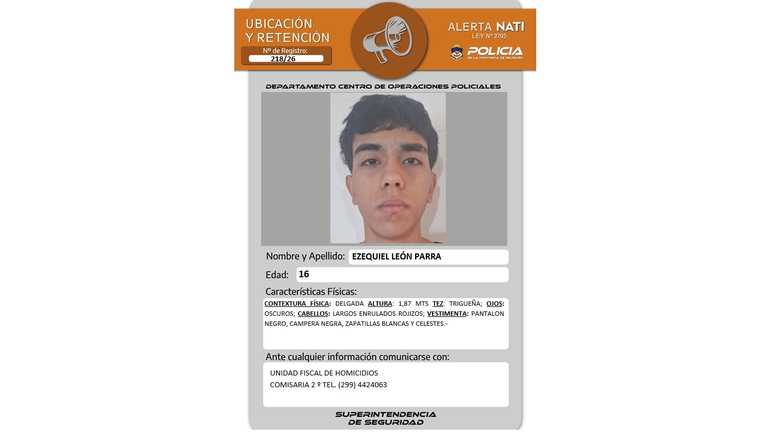 Por otro lado, la Policía busca al joven Ezequiel León Parra, de 16 años. La denuncia por su desaparición fue radicada en la Comisaría Segunda. Según la información aportada, el adolescente posee contextura física delgada, altura de 1,87 metros, tez trigueña, ojos oscuros y cabello largo ondulado rojizo.